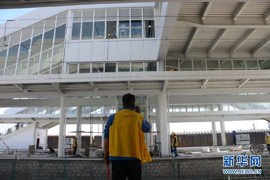 6月28日,在新建的青海省海西蒙古族藏族自治州格爾木火車站,工作人員在指揮施工。新華社記者 王浡 攝
