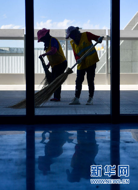6月28日,在新建的青海省海西蒙古族藏族自治州格爾木火車站,工人在清掃落客平臺。新華社記者 張龍 攝