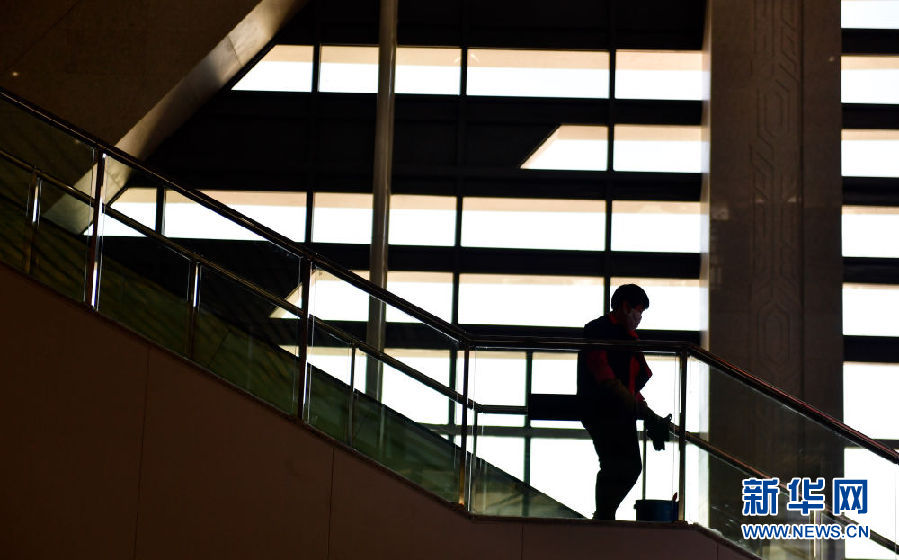 6月28日,在新建的青海省海西蒙古族藏族自治州格爾木火車站,保潔員在清潔樓梯。新華社記者 張龍 攝