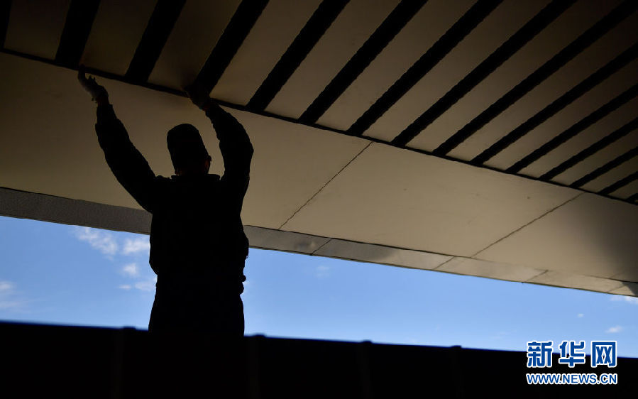 6月28日,在新建的青海省海西蒙古族藏族自治州格爾木火車站,工人在檢查站臺天花板。新華社記者 張龍 攝