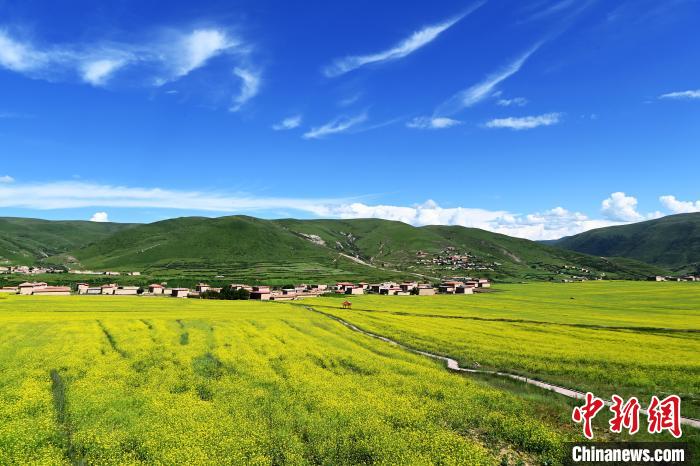 7月21日,四川省阿壩藏族羌族自治州阿壩縣麥昆鄉(xiāng)蠶不扎村高原油菜核心示范基地內(nèi),盛開的萬畝高原油菜花海吸引游客前來觀光打卡。