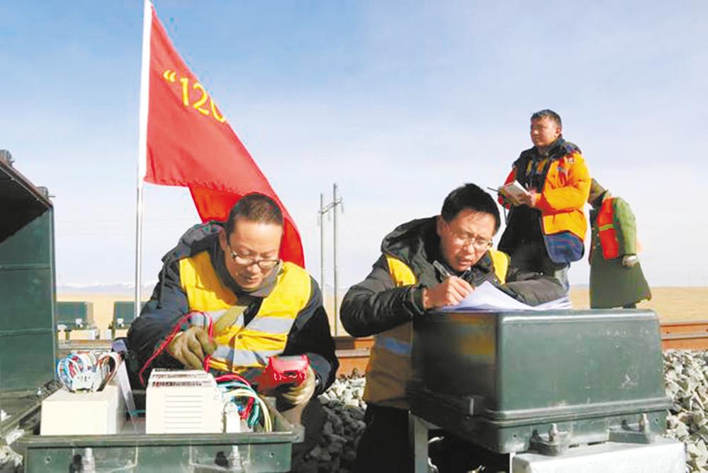 格爾木信號(hào)車間黨支部隊(duì)員正在進(jìn)行軌道電路檢修。格爾木信號(hào)車間供圖