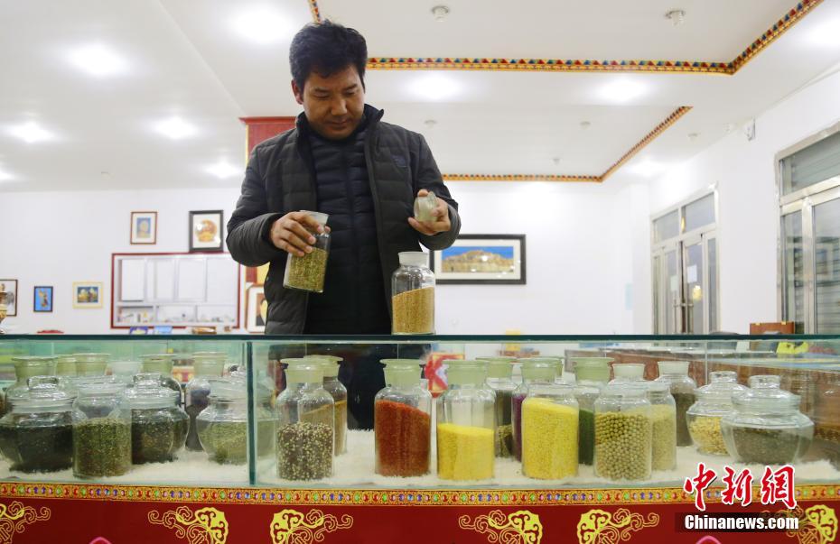 12月8日,青海省黃南藏族自治州尖扎縣,五谷畫藝人索南本查看農(nóng)作物儲(chǔ)存狀況。青稞、小麥、各式油菜籽等農(nóng)作物經(jīng)挑選、排列組合,“變身”精美的“尖扎五谷畫”。2007年,該縣藝人索南本開始創(chuàng)作藏式風(fēng)格五谷畫,摸索防臭、防蟲、防潮、裝裱等步驟,并在當(dāng)?shù)亻_展培訓(xùn),帶領(lǐng)殘疾、困難民眾進(jìn)行創(chuàng)作,憑雙手致富。 中新社記者 馬銘言 攝