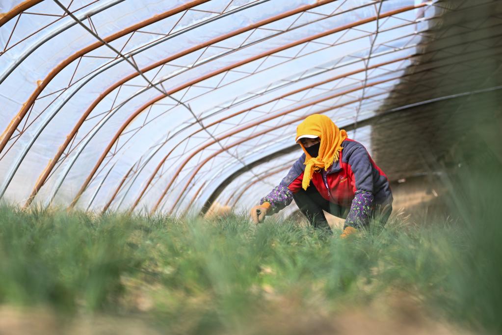 3月23日,藥農(nóng)在青海省海西蒙古族藏族自治州德令哈市柯魯柯鎮(zhèn)的藏紅花大棚內(nèi)除草。新華社記者 王浡 攝
