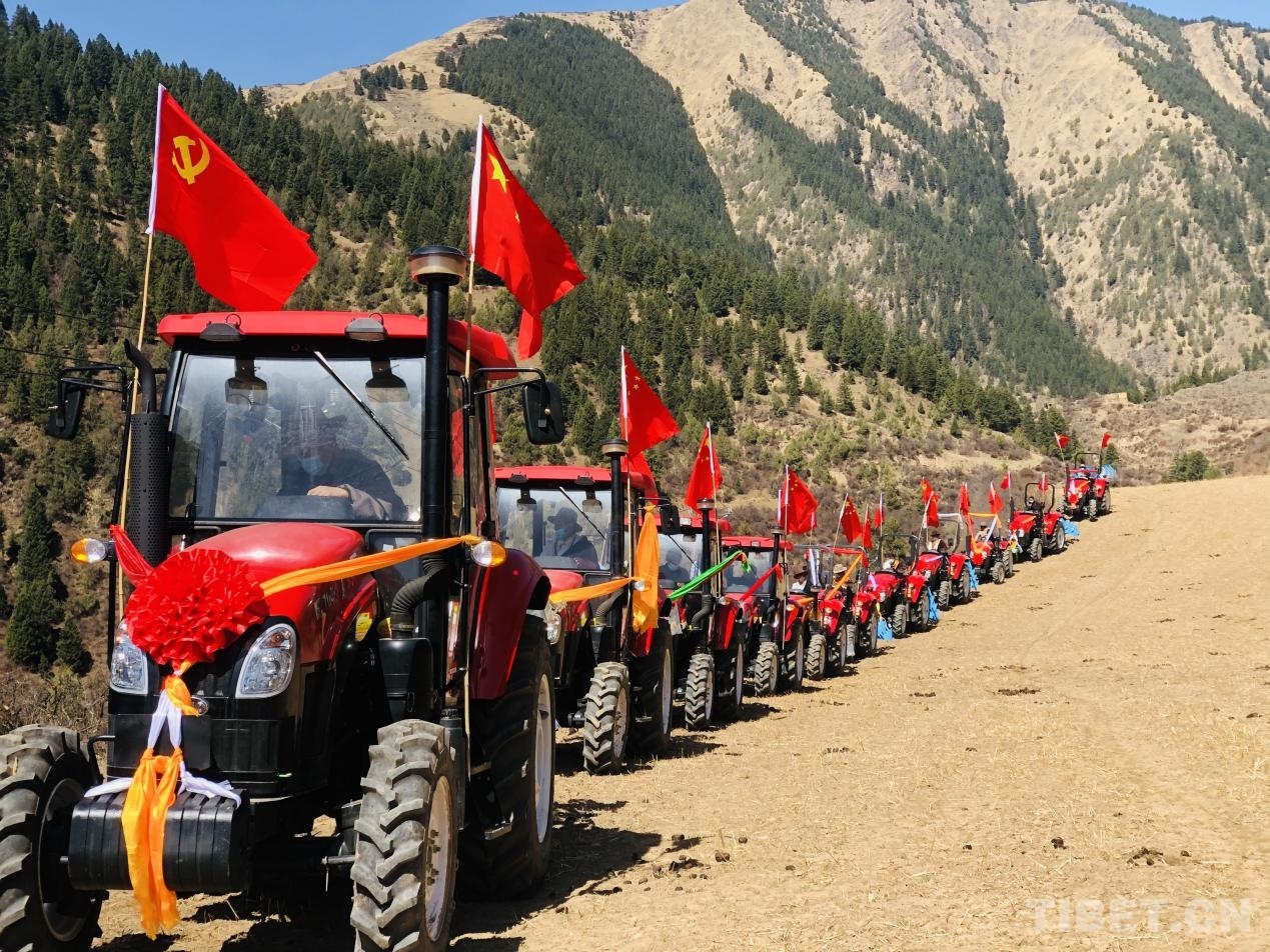 農(nóng)牧民群眾身穿節(jié)日盛裝,相聚在農(nóng)田里,端著預(yù)示豐收的黑青稞,捧著潔白的哈達(dá),牽著耕牛,開著輪式拖拉機(jī)齊聚田間地頭舉行開耕歡慶儀式。