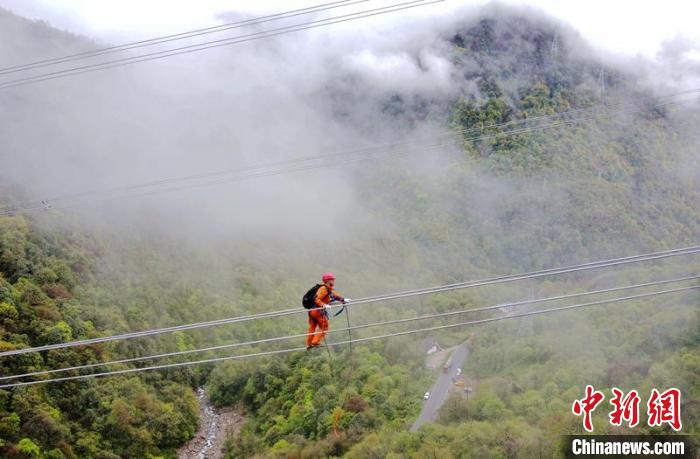 電力工人李小烈在二郎山上走線驗(yàn)收甘蜀改。潘柱東 攝