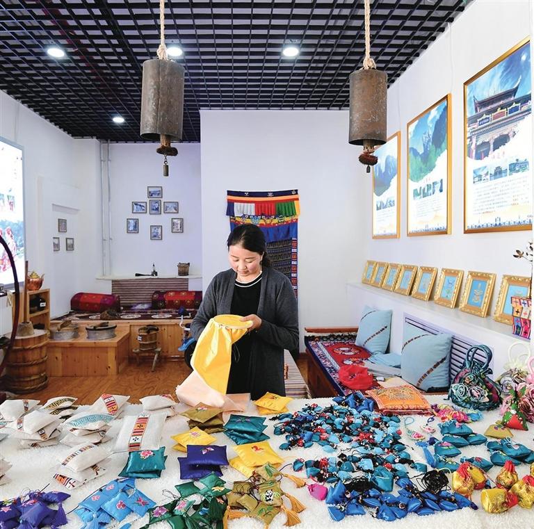 德琴巧手民俗文化旅游發(fā)展貿(mào)易有限公司負(fù)責(zé)人寧菊英正在繡香包。 新甘肅·甘肅日?qǐng)?bào)記者 韋德占