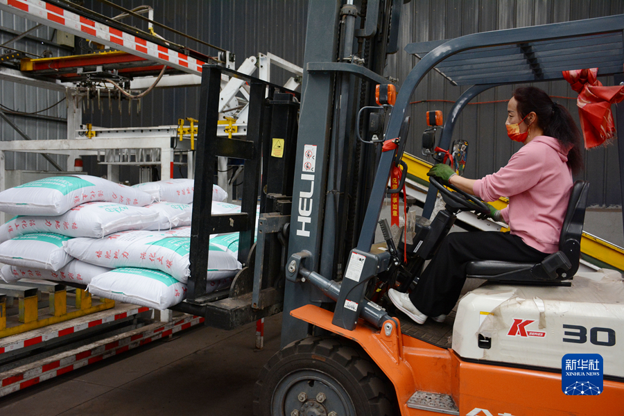 新華村生態(tài)有機肥加工廠內(nèi),工人正在用叉車搬運肥料。新華社記者 柳澤興 攝