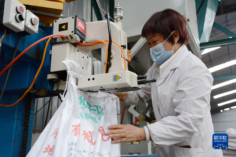 技術(shù)員王紅正在進行有機肥密封操作。新華社記者 柳澤興 攝