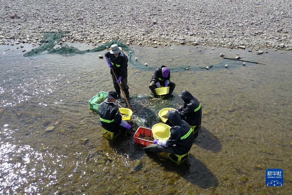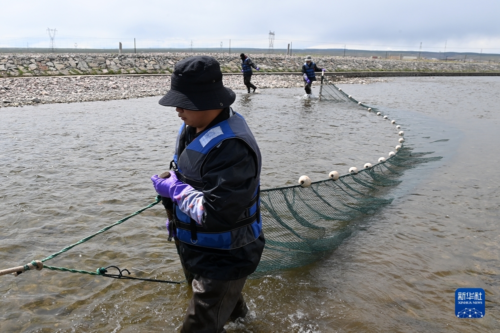 6月29日,工作人員在剛察縣境內(nèi)的泉吉河中采捕親魚。新華社記者 范培珅 攝