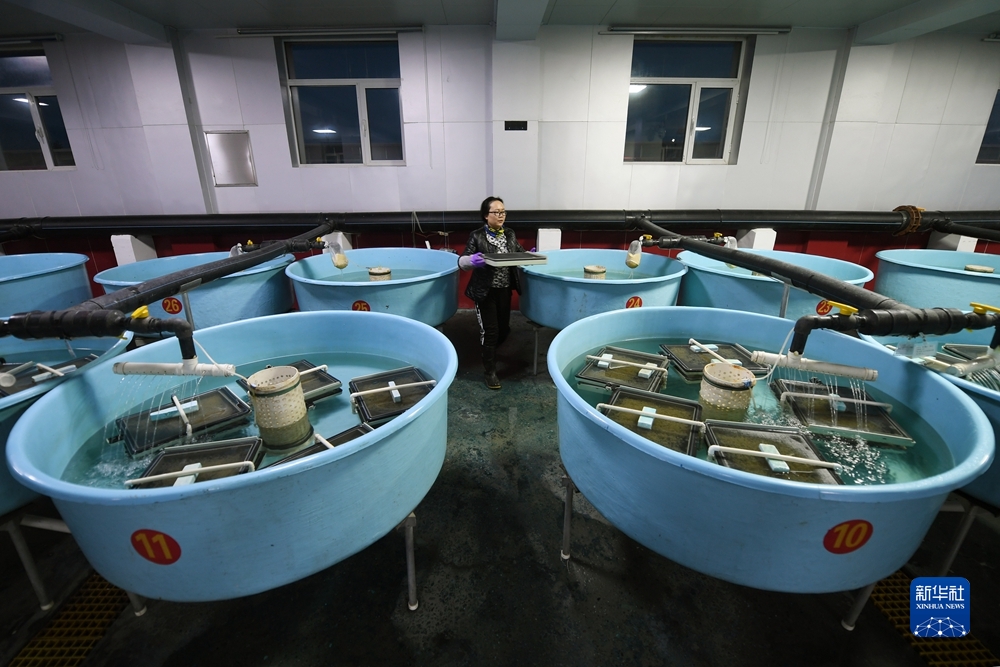 6月29日,在青海湖裸鯉沙柳河泉吉河增殖實驗站,工作人員查看圓形破膜缸中湟魚受精卵破膜情況。新華社記者 范培珅 攝