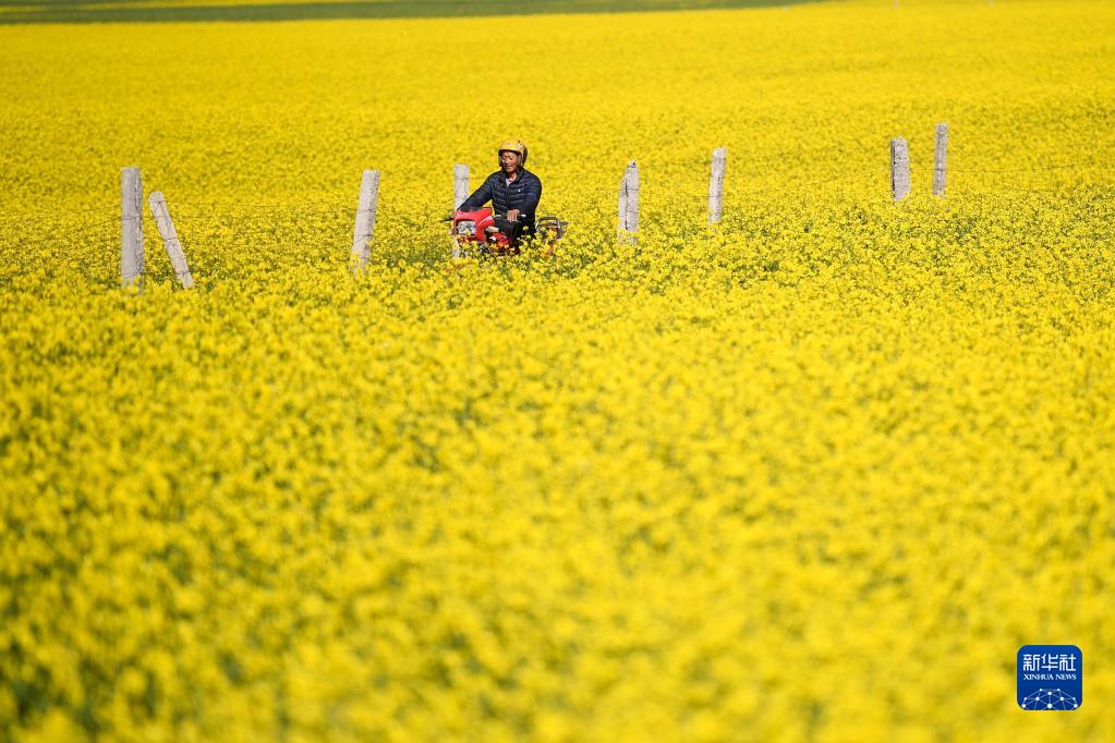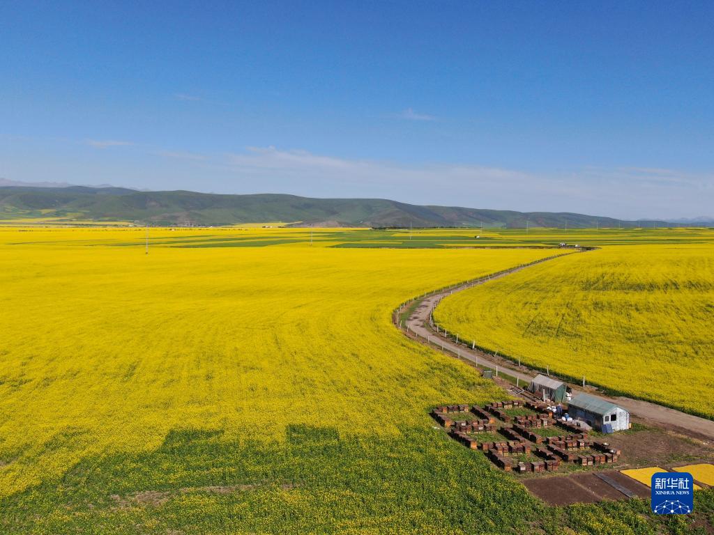 進(jìn)入七月,位于青海省海北藏族自治州門源回族自治縣的萬畝油菜花競相綻放。來自四川德陽的蜂農(nóng)馮躍宣在花海里忙碌。他從早上7點(diǎn)開始整理蜂箱、采集花粉、晾曬花粉,一直忙碌到晚上8點(diǎn)。
