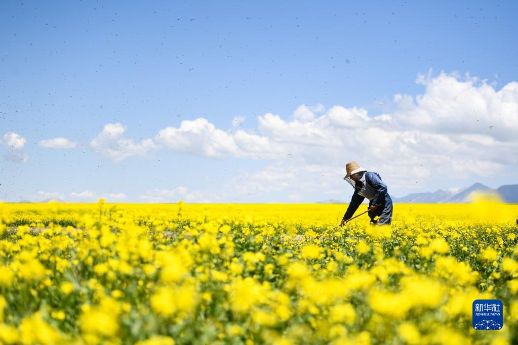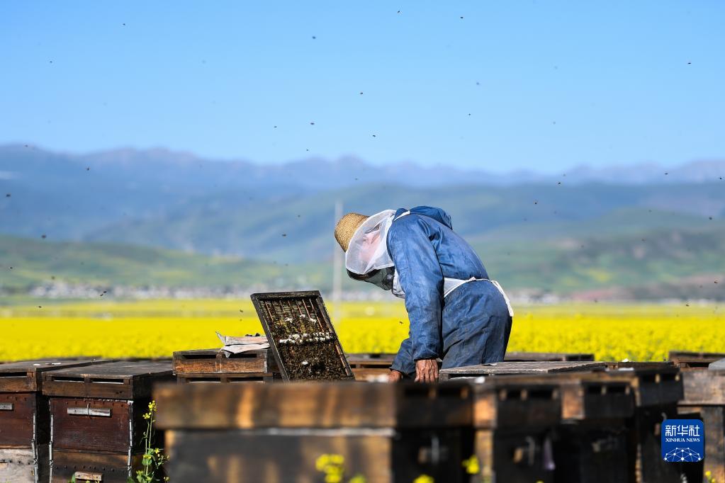 7月2日,在青海省海北藏族自治州門源回族自治縣的花田中,馮躍宣在查看蜜蜂。新華社記者 張龍 攝