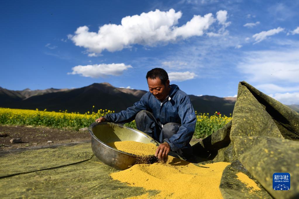 7月2日,在青海省海北藏族自治州門源回族自治縣的花田中,馮躍宣在晾曬花粉。新華社記者 張龍 攝