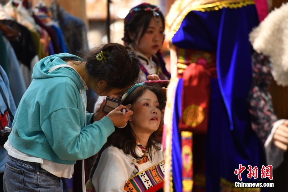 7月11日晚,游客在古城中一家旅拍店化妝。暑假期間,云南香格里拉市的旅拍市場火熱,游客們穿著藏族服裝變身“扎西”和“卓瑪”,在獨克宗古城留下旅行中的美好瞬間。中新社記者 劉冉陽 攝