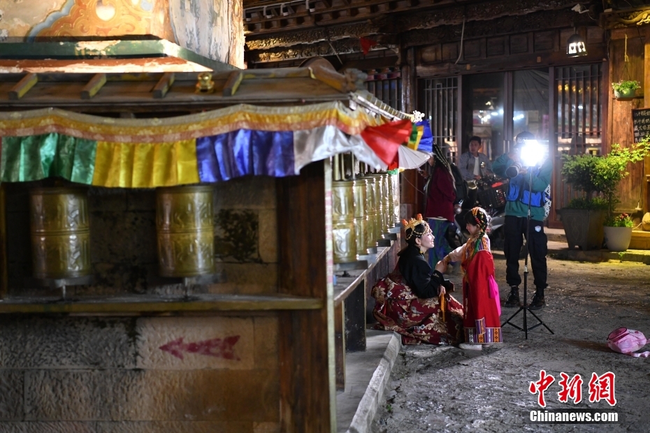 7月11日晚,游客在古城中拍照。暑假期間,云南香格里拉市的旅拍市場火熱,游客們穿著藏族服裝變身“扎西”和“卓瑪”,在獨克宗古城留下旅行中的美好瞬間。中新社記者 劉冉陽 攝