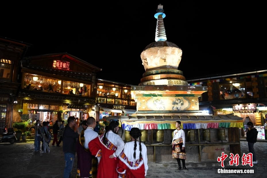 7月11日晚,游客在古城中打卡留念。暑假期間,云南香格里拉市的旅拍市場火熱,游客們穿著藏族服裝變身“扎西”和“卓瑪”,在獨克宗古城留下旅行中的美好瞬間。中新社記者 劉冉陽 攝