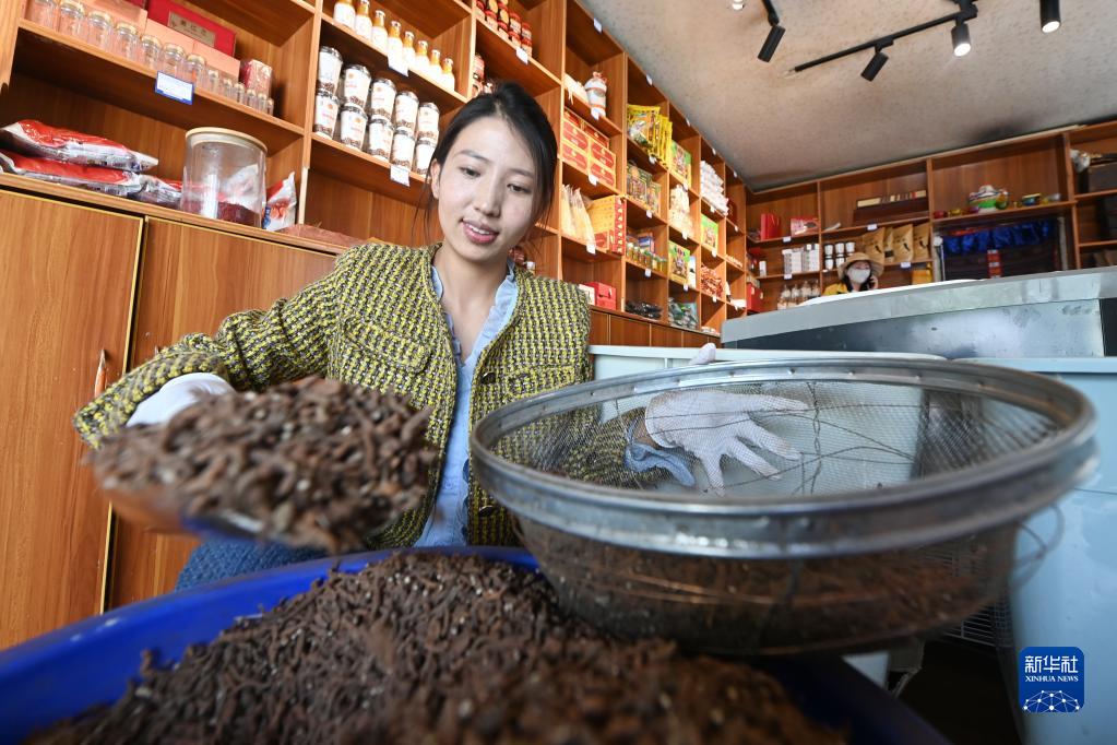 7月12日,在玉樹市察吾拉養(yǎng)殖種植專業(yè)合作社店鋪,代青永措在分裝農(nóng)特產(chǎn)品。 新華社記者 范培珅 攝