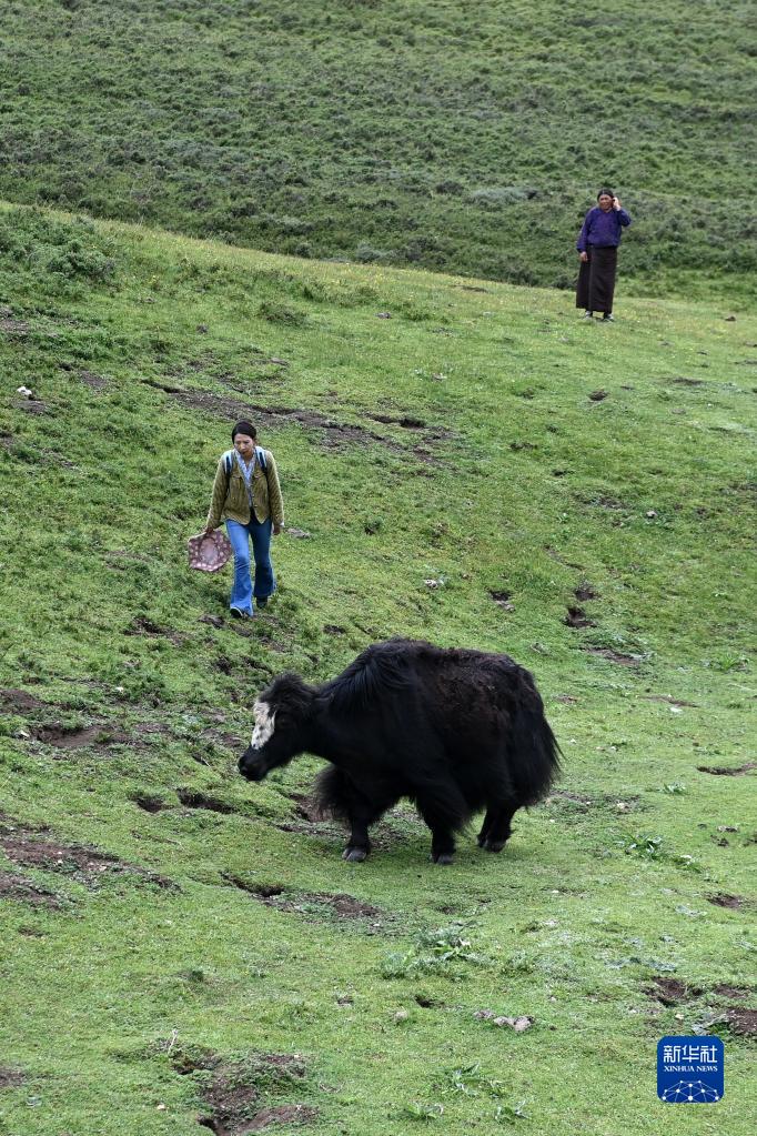 7月12日,在玉樹市巴塘鄉(xiāng)相古村的草場上,代青永措(左)查看牦牛長勢。 新華社記者 范培珅 攝