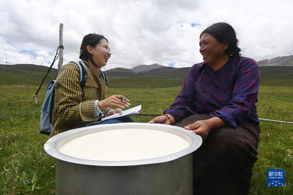 7月12日,在玉樹市巴塘鄉(xiāng)相古村的草場上,代青永措(左)與牧民商量今年農(nóng)特產(chǎn)品收購事宜。 新華社記者 范培珅 攝