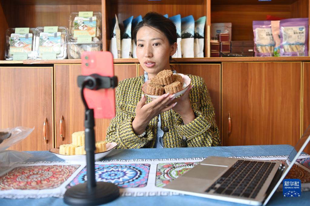 7月12日,在玉樹市察吾拉養(yǎng)殖種植專業(yè)合作社店鋪,代青永措在直播帶貨。 新華社記者 范培珅 攝