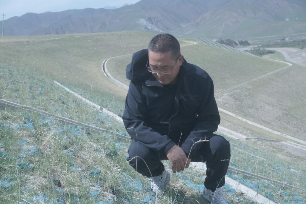 6月16日,祁連縣山水林田湖試點項目辦公室干部楊富存正在小八寶河河畔查看治理成效。新華社記者 周盛盛 攝