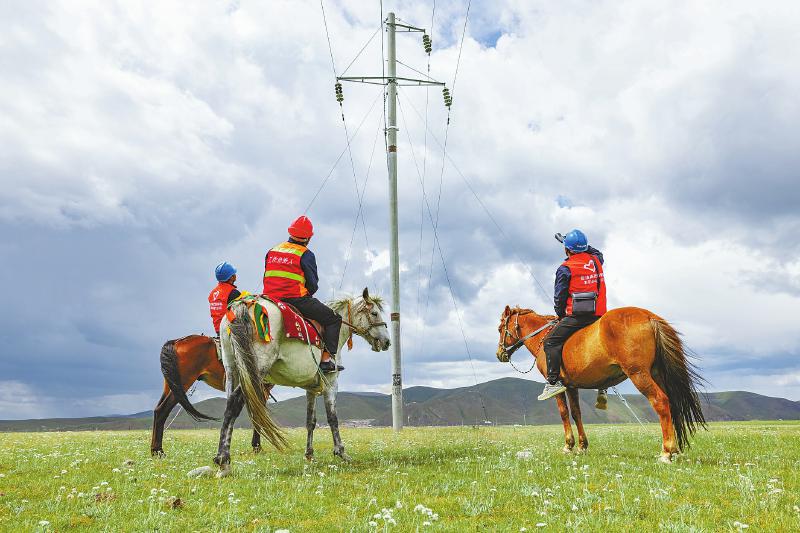 近日,國網石渠供電公司工作人員騎馬巡檢,排查線路隱患。洛絨尼瑪 攝