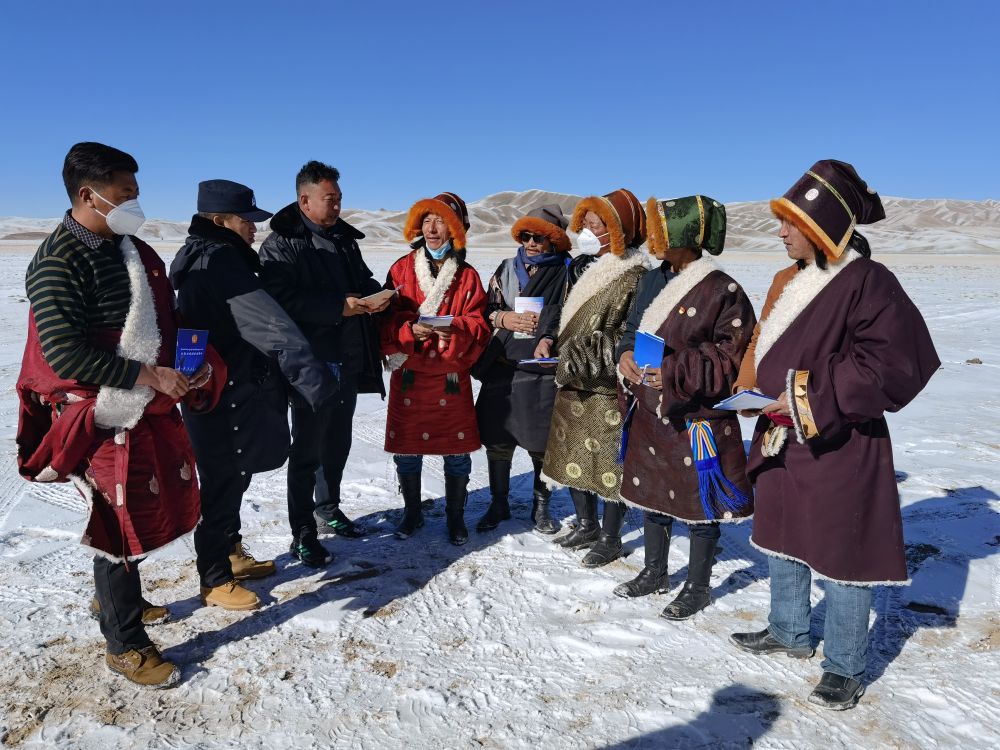 2021年12月20日,瑪多縣人民法院院長錢快乾(左三)給當(dāng)?shù)啬撩裥v法律知識。新華社記者 柳澤興 攝