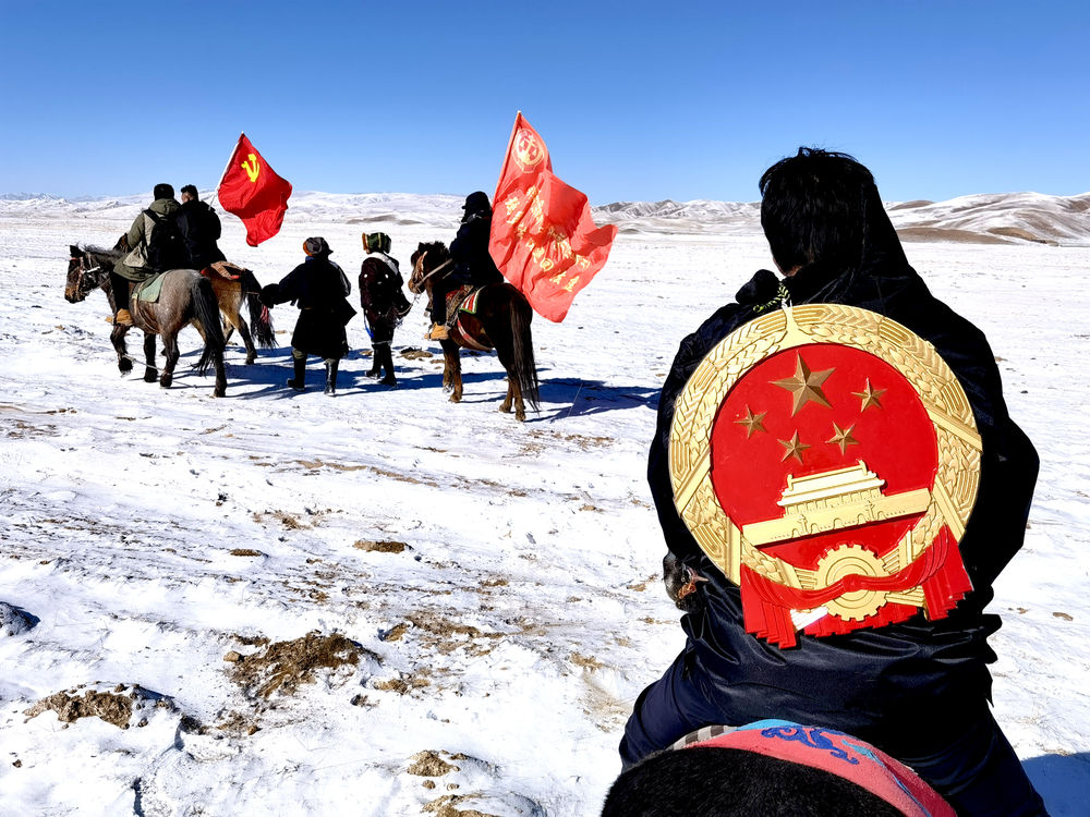 2021年12月20日,瑪多縣人民法院院長錢快乾騎著馬,擎著“瑪多法院巡回法庭”的旗子,下鄉(xiāng)進(jìn)行普法宣傳。新華社發(fā)