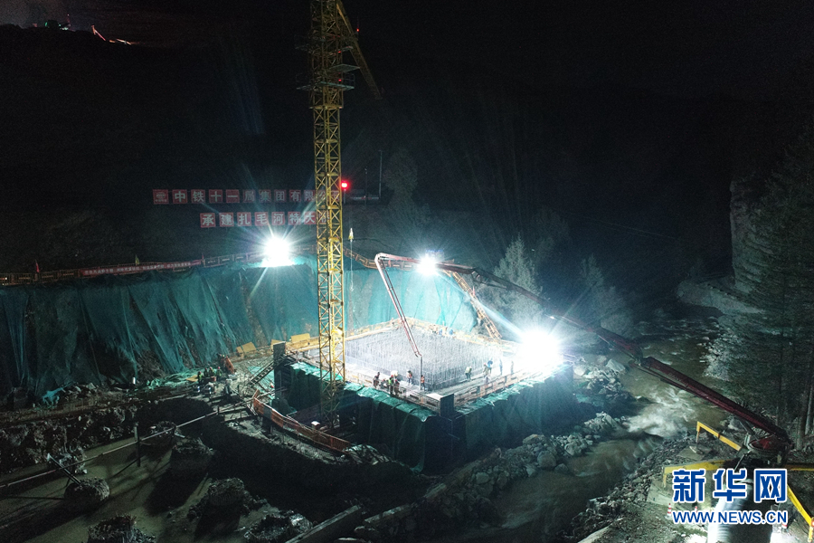 11月7日,中鐵十一局施工人員在同賽公路扎毛河特大橋左幅10#墩承臺澆筑現(xiàn)場開展夜間作業(yè)。