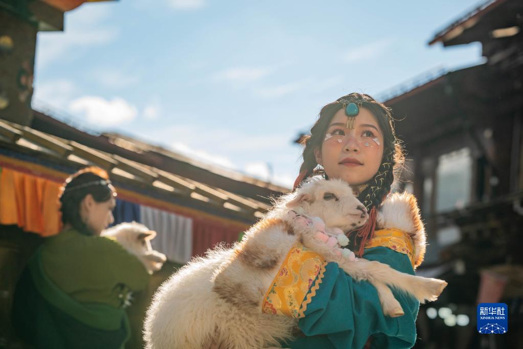 3月8日,游人在獨(dú)克宗古城里抱著小羊拍照留念。新華社記者 胡超 攝