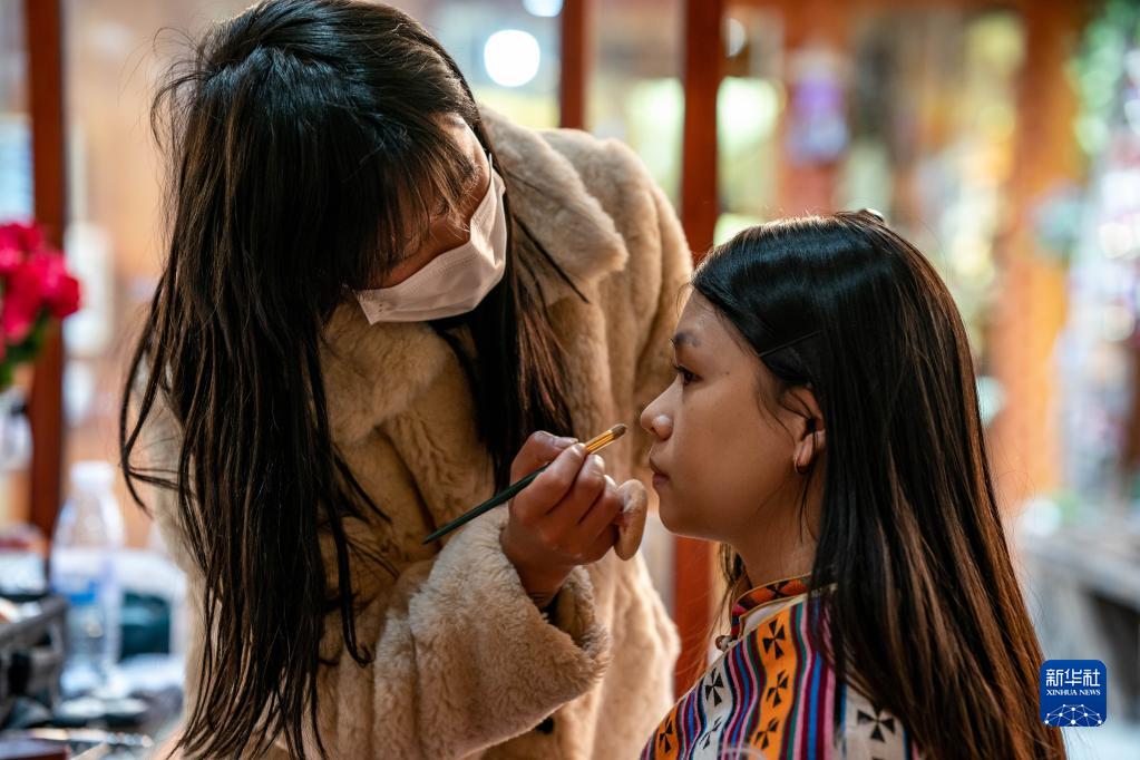 3月8日,游客(右)在獨(dú)克宗古城里的一家藏裝店化妝。新華社記者 胡超 攝