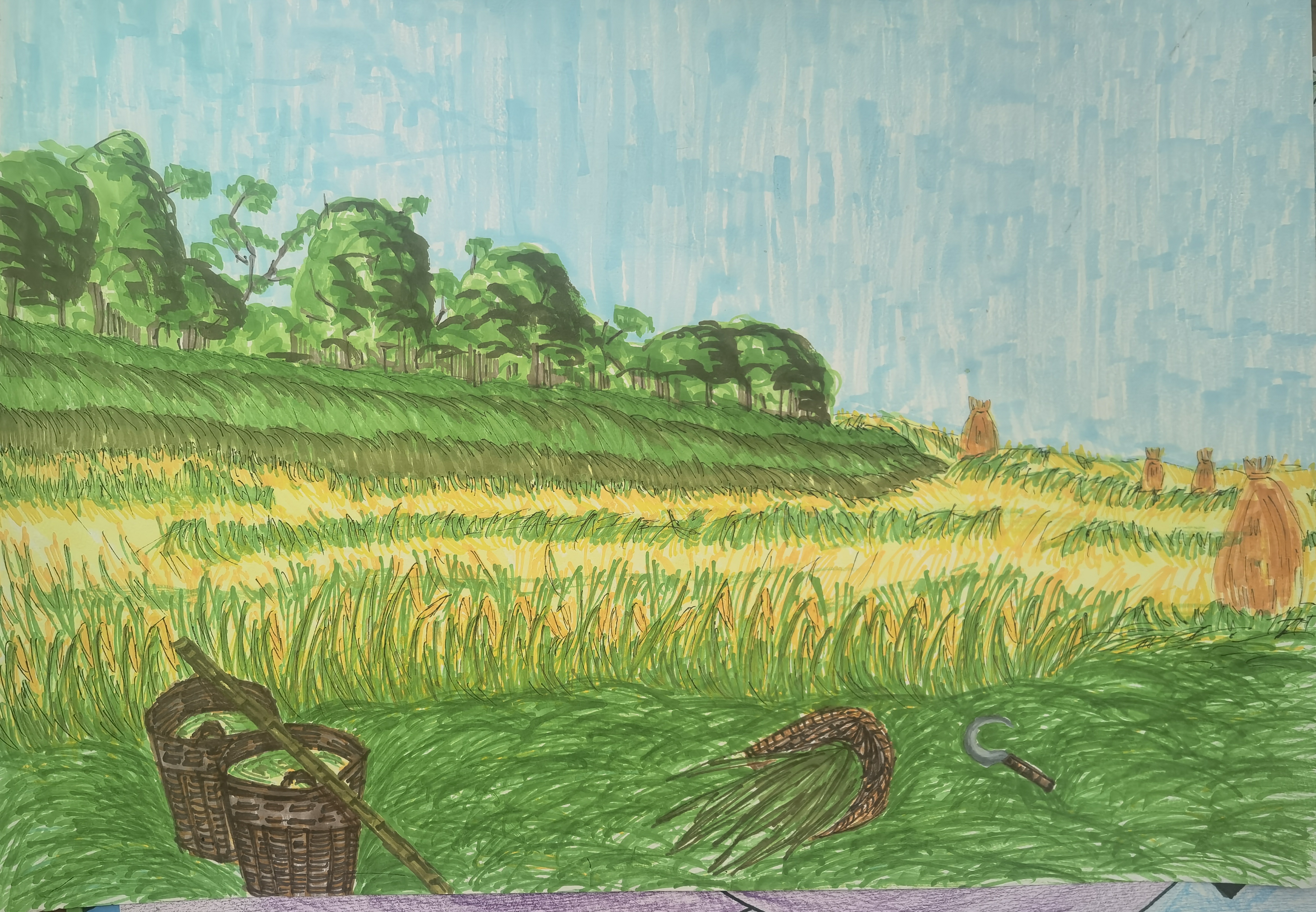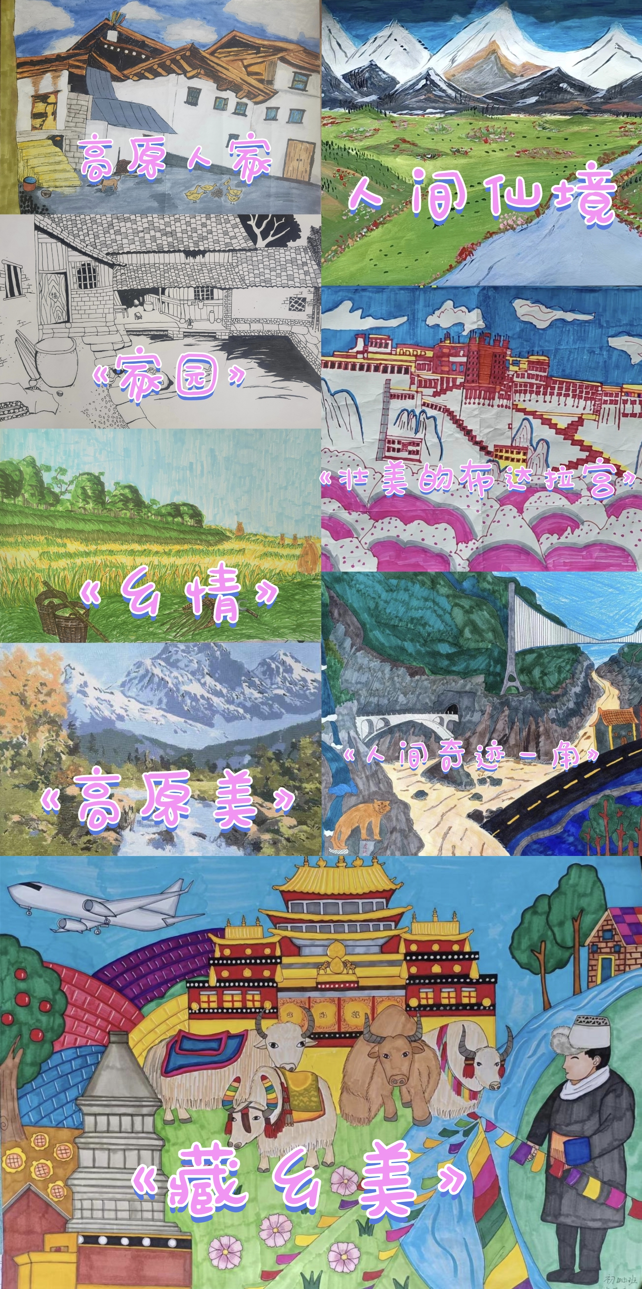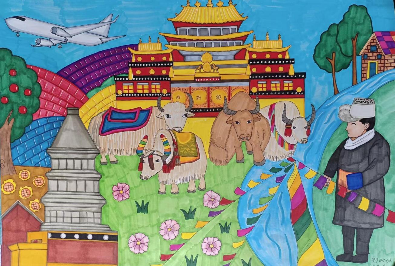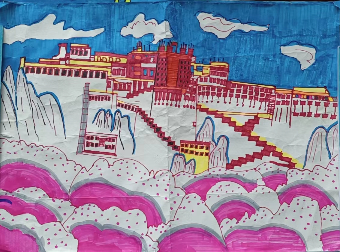 其中,初三年級(jí)141班拉茸拉姆作品《高原美》榮獲一等獎(jiǎng)。初141班邱霞作品《鄉(xiāng)情》、初二年級(jí)153班和凱琪作品《人間奇跡一角》榮獲二等獎(jiǎng)。初156班格茸培初作品《壯麗的布達(dá)拉宮》、初一年級(jí)161班金安拉姆作品《美麗的松贊林寺》、初164班貢桑措母作品《松贊林寺》榮獲三等獎(jiǎng)。