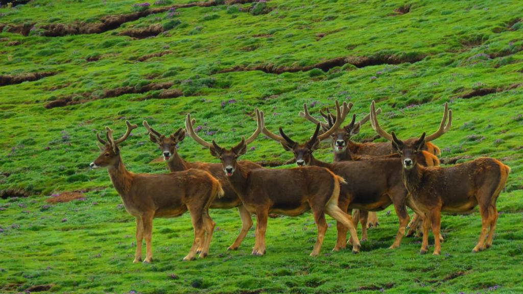在青海省玉樹藏族自治州曲麻萊縣曲麻河鄉(xiāng)昂拉村拍攝的白唇鹿(2018年8月6日攝)。新華社 濤西昂扎攝