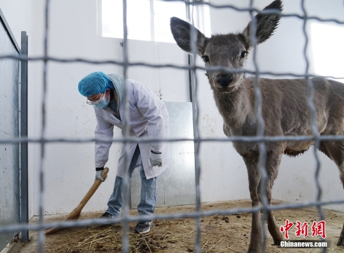 圖為野生動(dòng)物救護(hù)繁育員正在飼喂馬鹿。包雷 攝