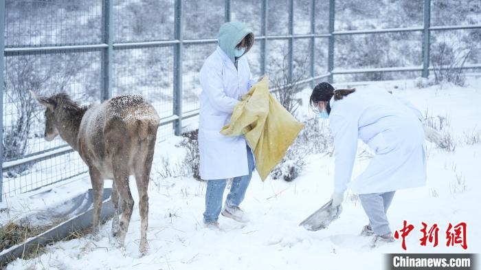 圖為頂風(fēng)冒雪工作的野生動(dòng)物救護(hù)繁育員。包雷 攝
