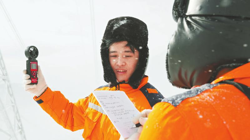 2023年春節(jié)前夕,海拔3000米的二郎山上,電力工人正在測(cè)量風(fēng)速。劉湘釩 攝