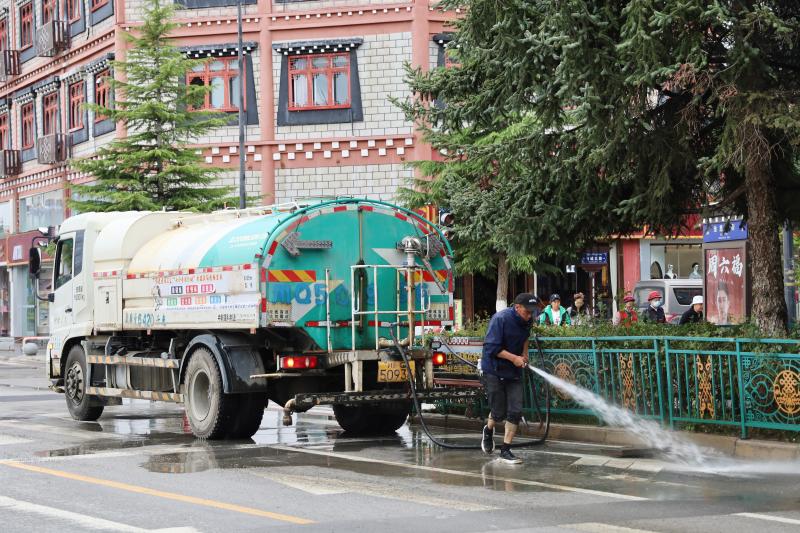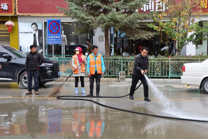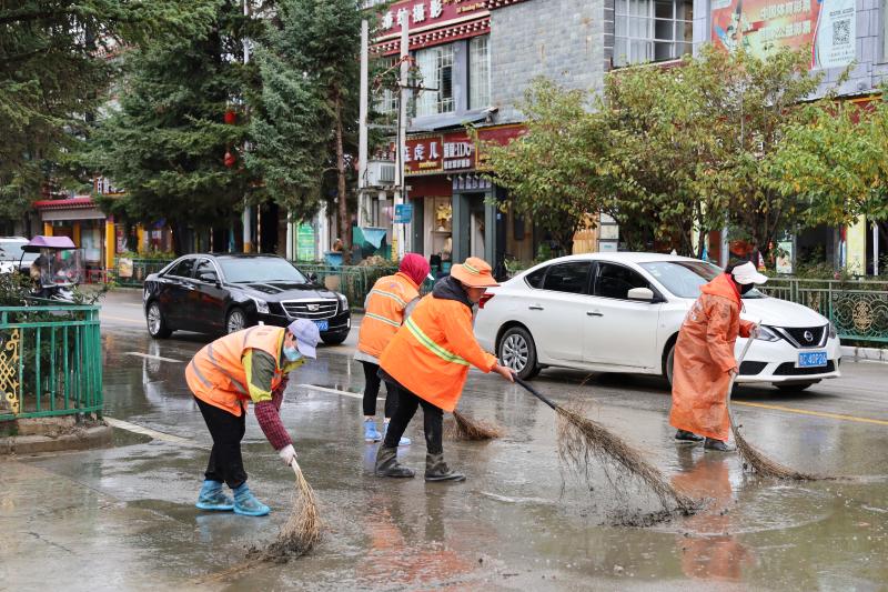 為盡快恢復(fù)城區(qū)潔凈容貌,香格里拉市和祥環(huán)??萍加邢挢?zé)任公司立即組織環(huán)衛(wèi)工人30名,抽調(diào)高壓水車2輛、掃地車4輛,積極開展道路清淤工作,同時(shí)對(duì)下水道水口周邊的樹枝、雜物等進(jìn)行清理清運(yùn)。經(jīng)過近五小時(shí)的連續(xù)作業(yè),成功恢復(fù)道路暢通整潔。