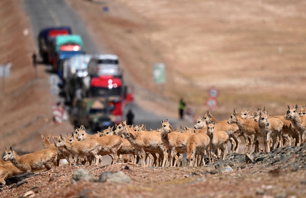 2023年5月29日,一群待產(chǎn)雌性藏羚羊正在通過青藏公路前往可可西里卓乃湖產(chǎn)仔。新華社記者 張宏祥 攝