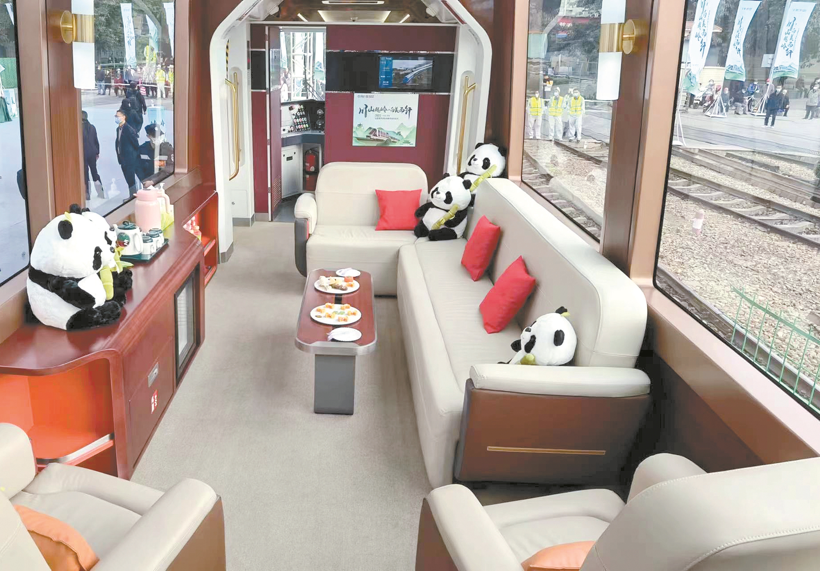 “列車采用4節(jié)編組,額定載客數145人,內飾分為豪華VIP家庭式包廂、豪華觀光卡座區(qū)、普通座區(qū)三種座位區(qū),滿足乘客多種乘車需求。它還具有國內最大面積曲面觀光玻璃窗,可實現車內游客與自然景觀的深度交流?!毕嚓P負責人向記者介紹道。
