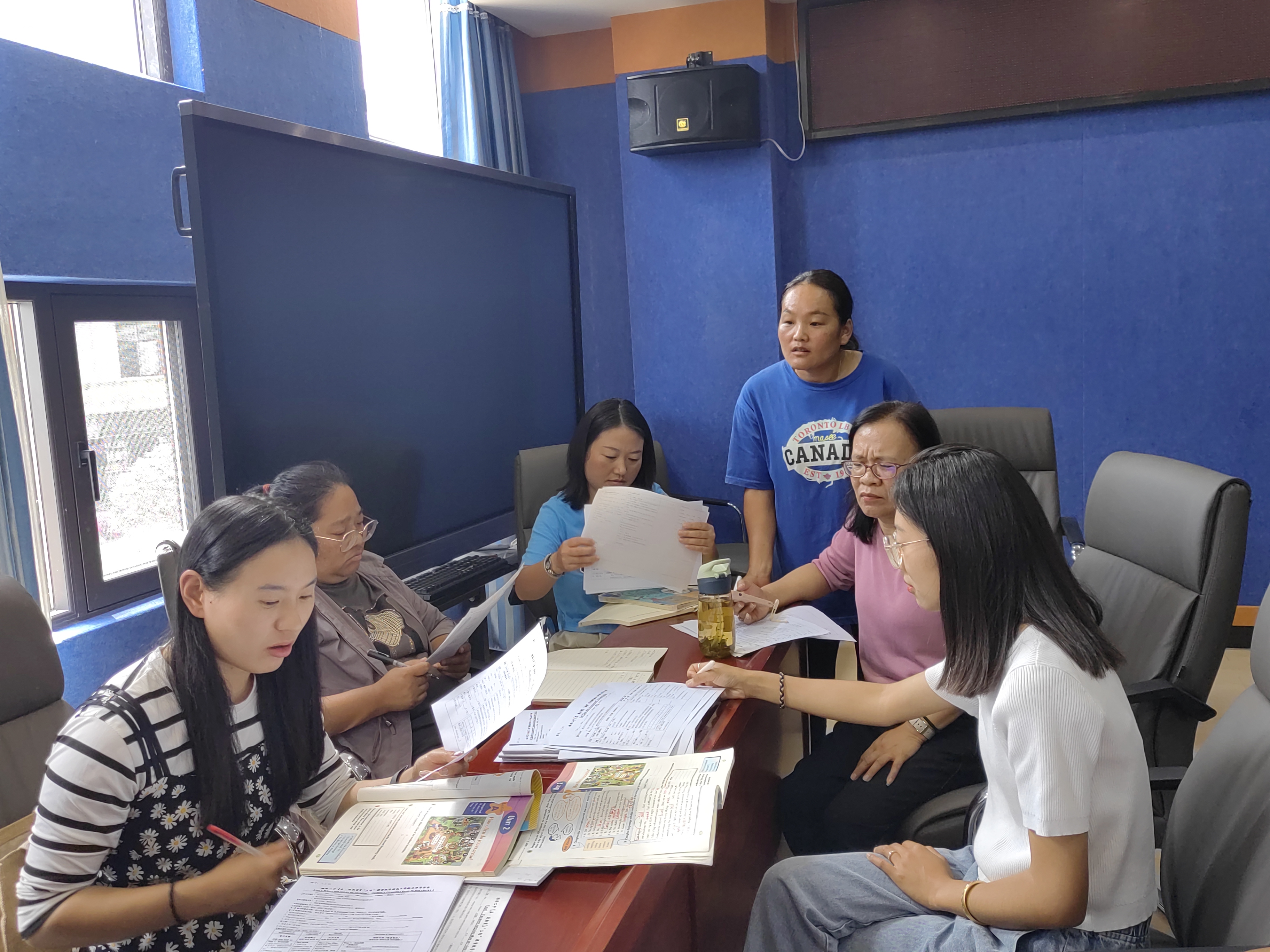 陳兆鴻(右三)正與三個年級的英語老師研討(張燕 攝)