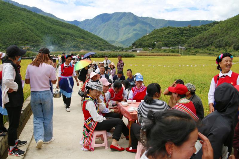 傍晚時分,炊煙氤氳,啟別村的百家宴上,稻田鴨、稻田魚、土雞肉、臘豬腳、大米飯……香氣四溢,金燦燦的稻田邊,桌與桌相接,心與心相連,大家在田野里感受著別樣豐收。