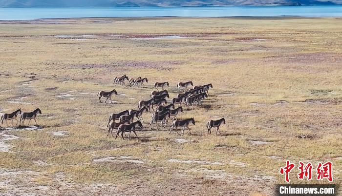 圖為無(wú)人機(jī)航拍成群藏野驢在湖邊漫步。 瑪多縣委宣傳部 供圖