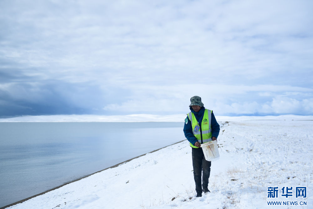 在青海省果洛藏族自治州瑪多縣扎陵湖鄉(xiāng)勒那村,三江源國(guó)家公園黃河源園區(qū)生態(tài)管護(hù)員在扎陵湖邊撿拾垃圾。新華社記者 張龍 攝