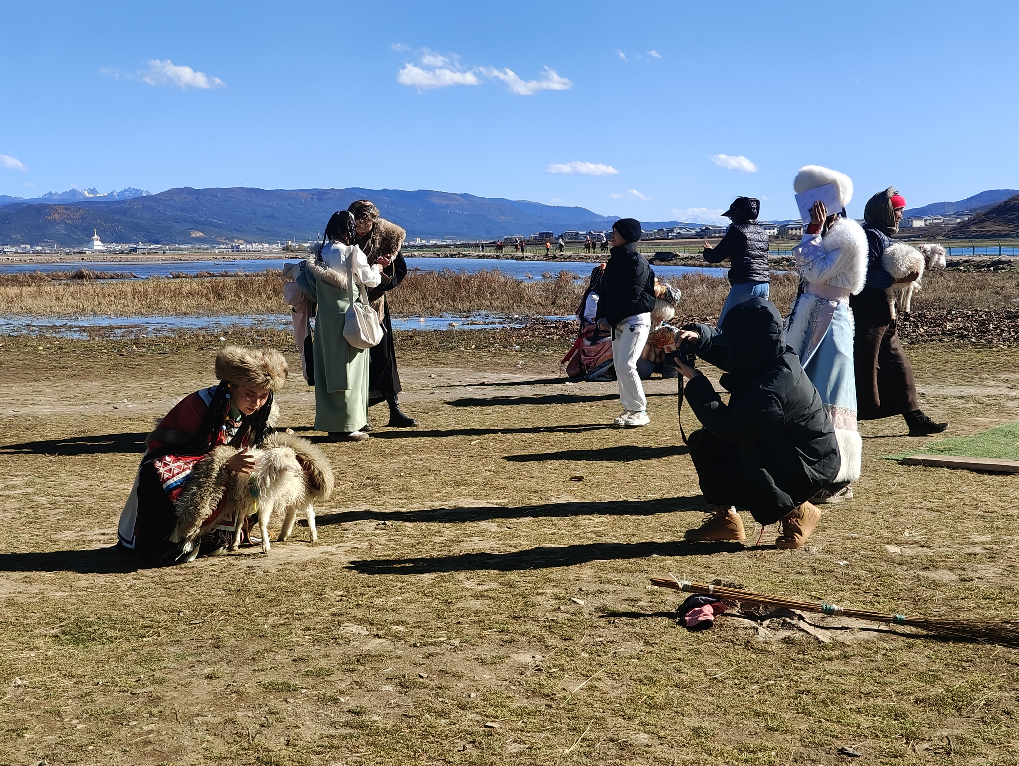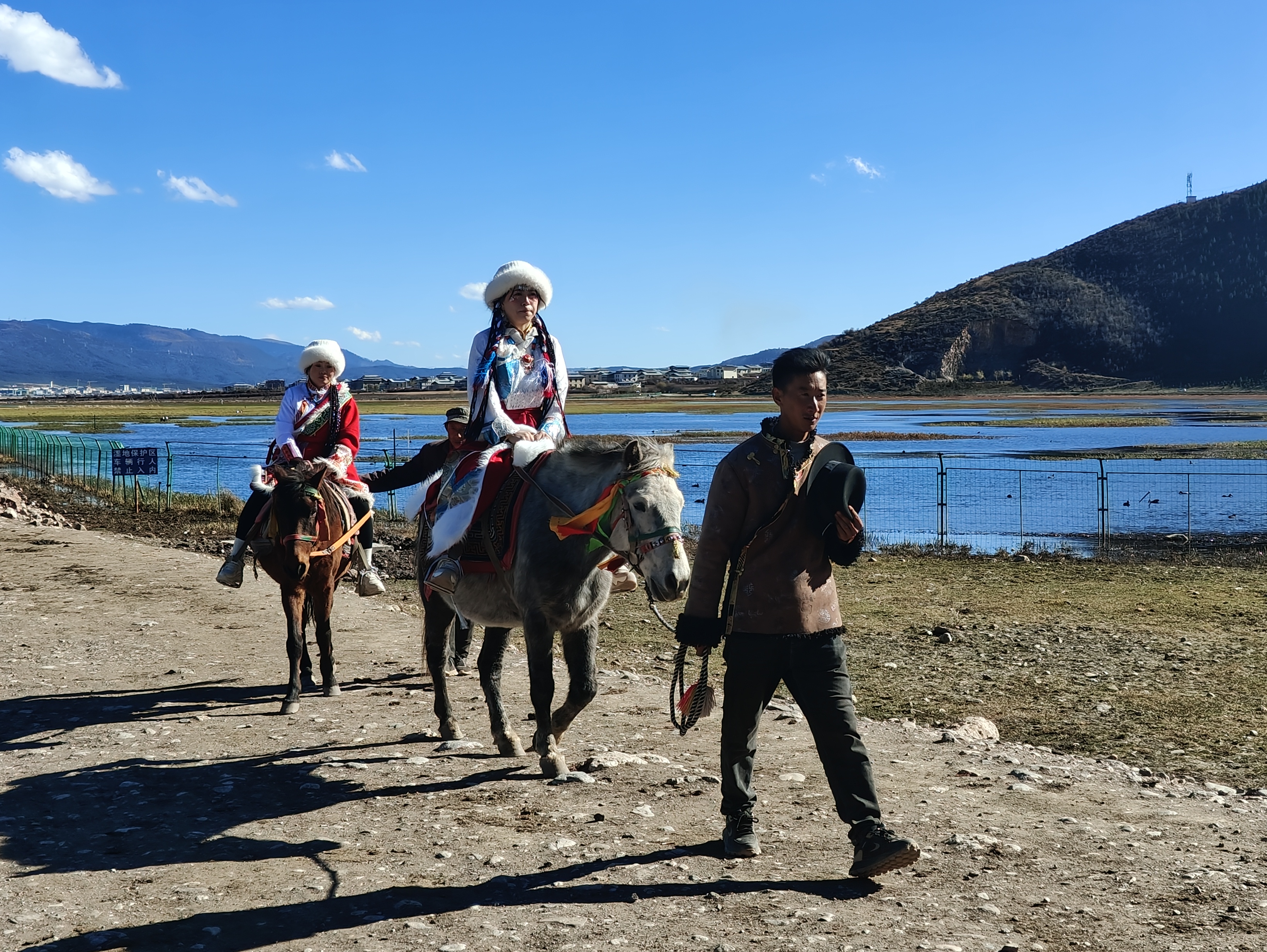 進(jìn)入11月,迪慶的氣溫雖然持續(xù)下降,但并不影響游客們的游玩熱情。納帕海陽(yáng)光明媚、碧波蕩漾,不少游客選擇到納帕海環(huán)湖游,騎行的、騎馬的、賞景的、拍照的游客絡(luò)繹不絕。圖為游客在納帕海濕地騎馬,體驗(yàn)藏族馬背文化魅力。