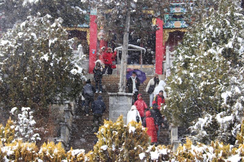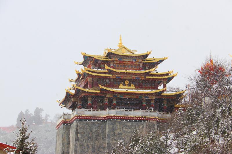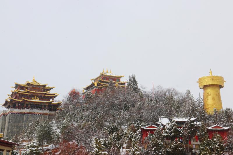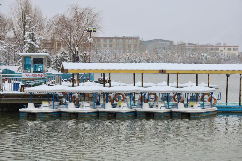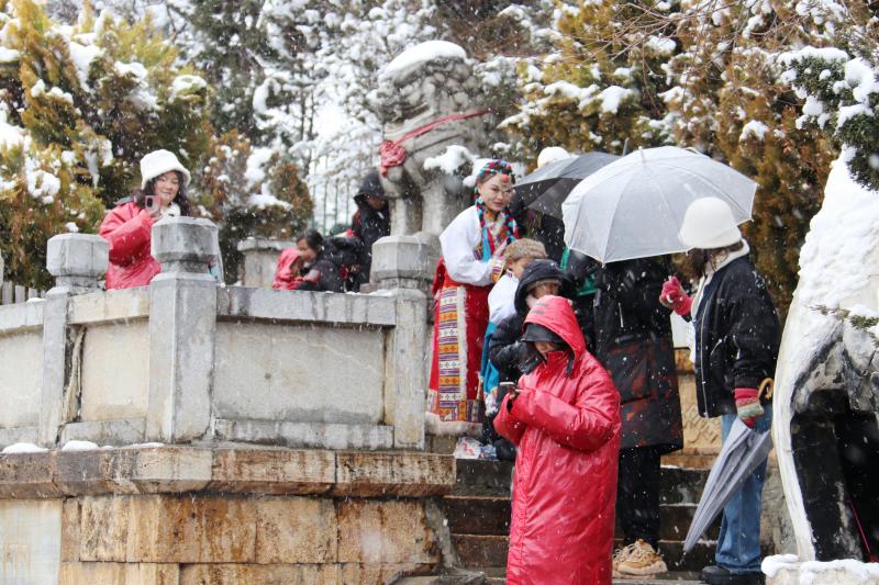 春節(jié)后第一場雪,雪花紛紛揚(yáng)揚(yáng)飄落,為香巴拉公園內(nèi)的各處景觀增加了別樣意趣。