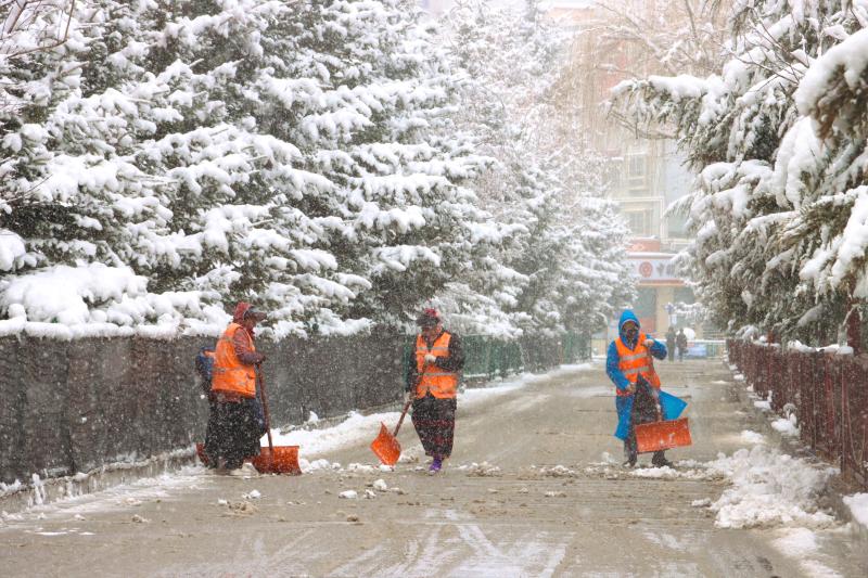 雪后香格里拉市區(qū)內(nèi)的樹木、道路等均被積雪覆蓋,猶如披上了一層“白紗”。市民和游客在高原冰雪景色中拍照打卡、游玩嬉戲,清潔工迅速出動掃雪,保障行人、車輛出行安全。