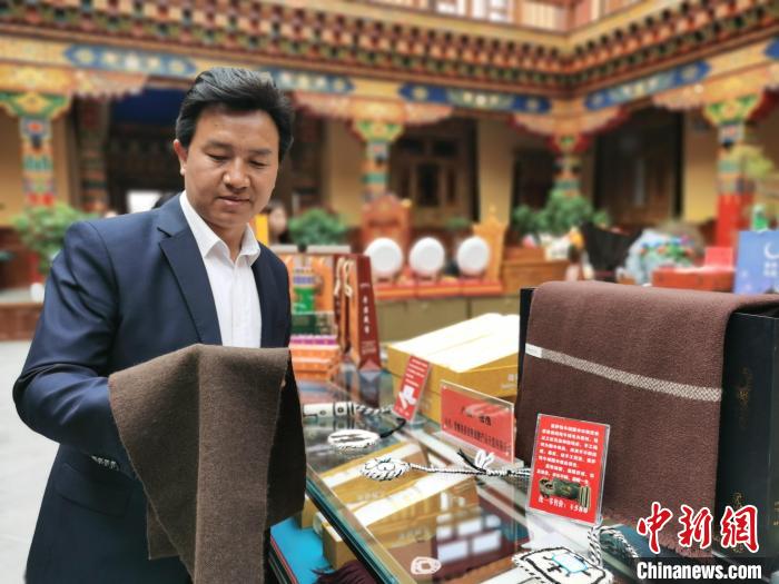 圖為尖扎縣手工藝者展示氆氌。張?zhí)砀z