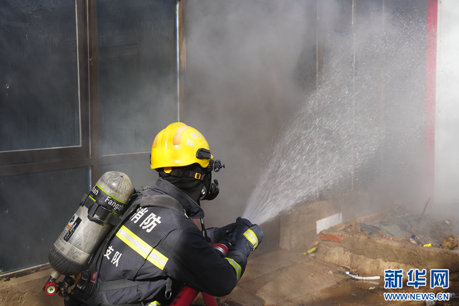 在演練現(xiàn)場(chǎng),消防員正在撲救模擬的房屋火災(zāi)。(海南州消防救援支隊(duì)供圖)
