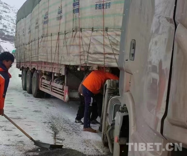 圖為公路養(yǎng)護(hù)者為打滑車(chē)輛拋灑防滑沙并上防滑鏈 供圖:澤旺卓瑪